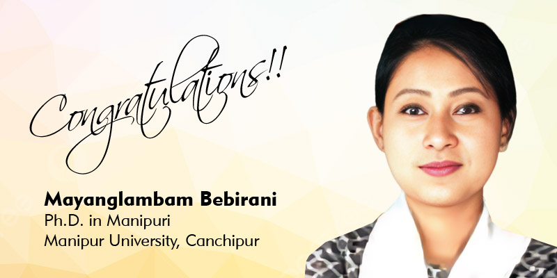 We would like to extend our warmest congratulations to Miss Mayanglambam Bebirani Devi daughter of Mayanglambam Tombi Singh (Senior Lecturer, Mathematics, Kakching Khunou College) and Thongam Pishakmacha Devi (Retd. Assistant Teacher, Kakching Khunou Makha High School) of Kakching Khunou Hijam Maning Leikai on the award of the degree of Doctor of Philosophy (Ph. D) for her thesis entitled “Sheetaljitki Upanyasta Yekliba Nupigi Shaktam” in Manipuri. She conducted her research work under the supervision of Prof. P. Nabachandra Singh and Co-Supervision of Prof. N. Aruna, Dept. of Manipuri, Manipur University, Canchipur, Imphal.